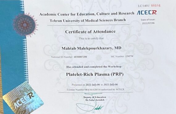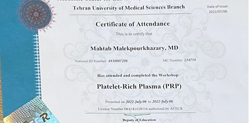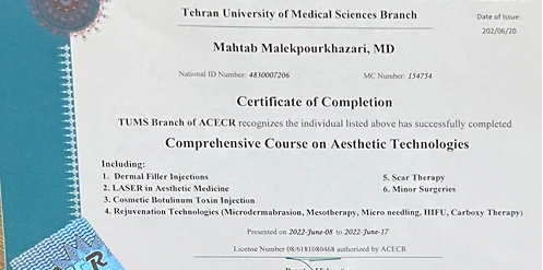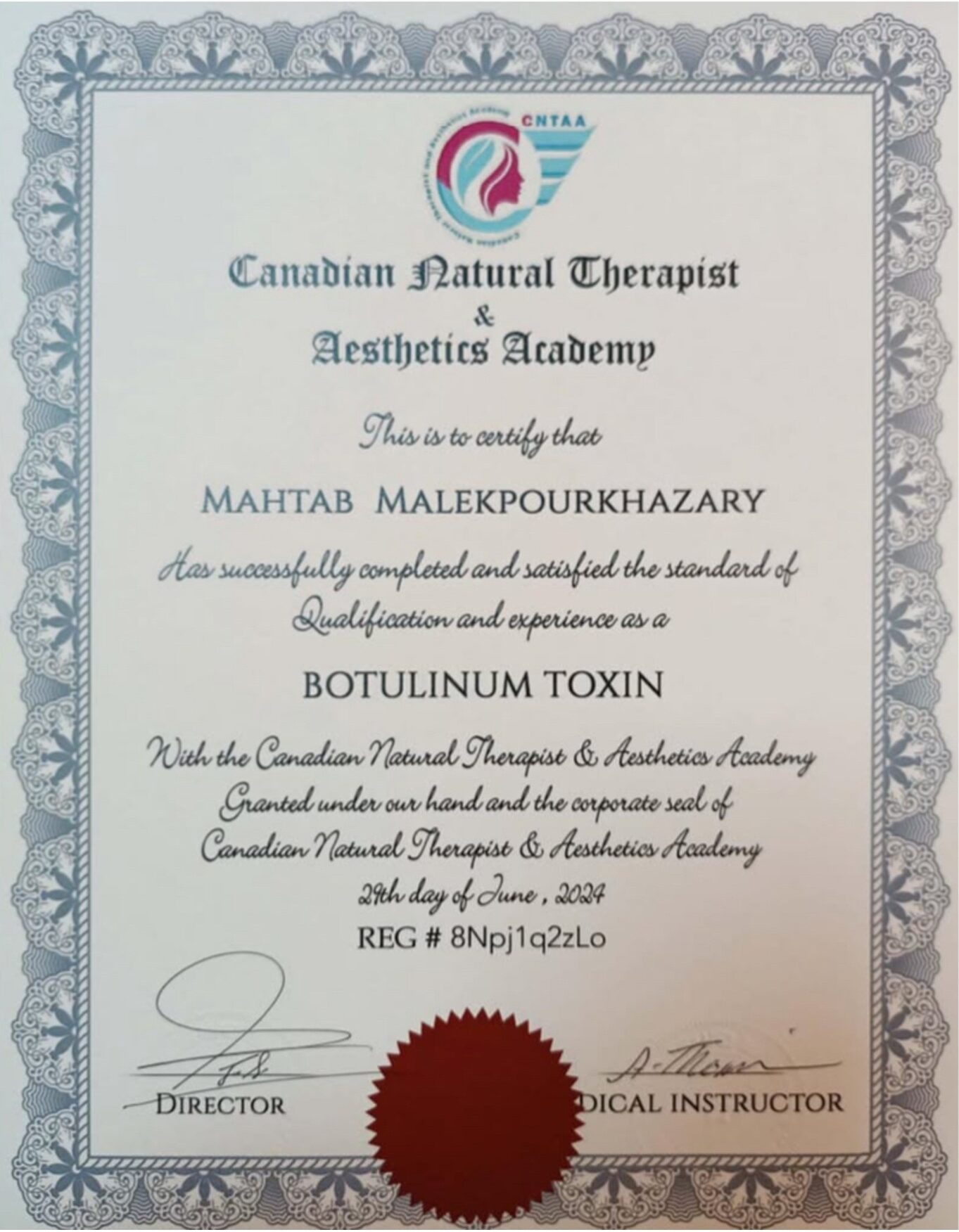 در کنار این کار به دلیل علاقه به رشته medial aesthetics (پزشکی زیبایی) دورهی تزریقات و علم پزشکی زیبایی را در کالج CNTAA واقع در ایالت ontario کانادا با قبولی با نمره ۱۰۰ /۱۰۰ و کسب مدرک معتبر مورد قبول اشتغال به کار در تمام ایالت های کشور کانادا را به پایان رساندم و در ایران نزد برترین اساتید این حوزه علم و تجربه خود را گسترده تر کرده و دروه های جامع جهاد دانشگاهی دانشگاه علوم پزشکی تهران و همچنین شهید بهشتی با کسی مدرک قبولی تاکنون به مدت ۵ سال در این حوزه فعالیت داشته در این میان certificate های زیادی در قسمت های مختلف این حوزه کسب کرده و هموراه در این زمینه دانش خود را بروز کرده ام